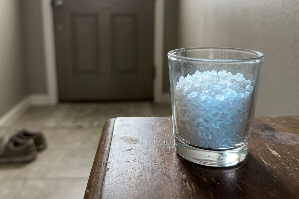 Il recipiente va poi sistemato accanto alla porta d’ingresso, sul pavimento o su un mobile basso, in un punto dove non rischi di rovesciarsi. Si lascia agire per 24 fino a 72 ore, a seconda di quanto l’ambiente è umido o carico di odori. Se il sale appare bagnato, indurito o ha cambiato colore, significa che si è già saturato: in quel momento va eliminato e sostituito. Chi desidera rafforzare ulteriormente l’effetto può utilizzare due contenitori, uno a destra e uno a sinistra dell’ingresso, creando una sorta di “guardia” doppia.