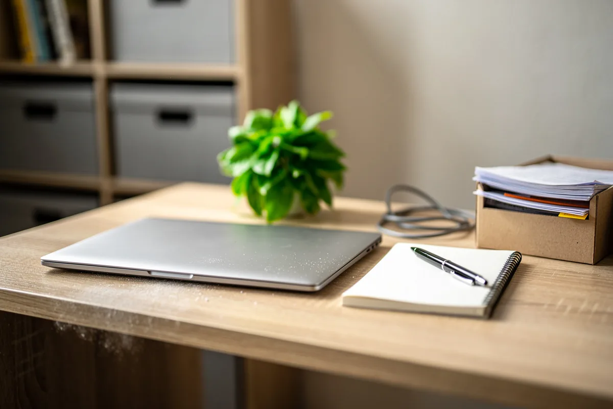 Per rendere il rituale sostenibile, prepara una piccola “stazione ordine” vicino alla tua zona di lavoro con: