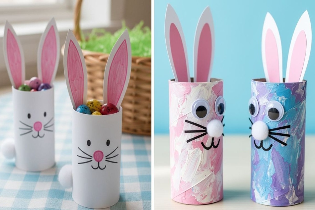 Rotoli di cartone trasformati in coniglietti pasquali.